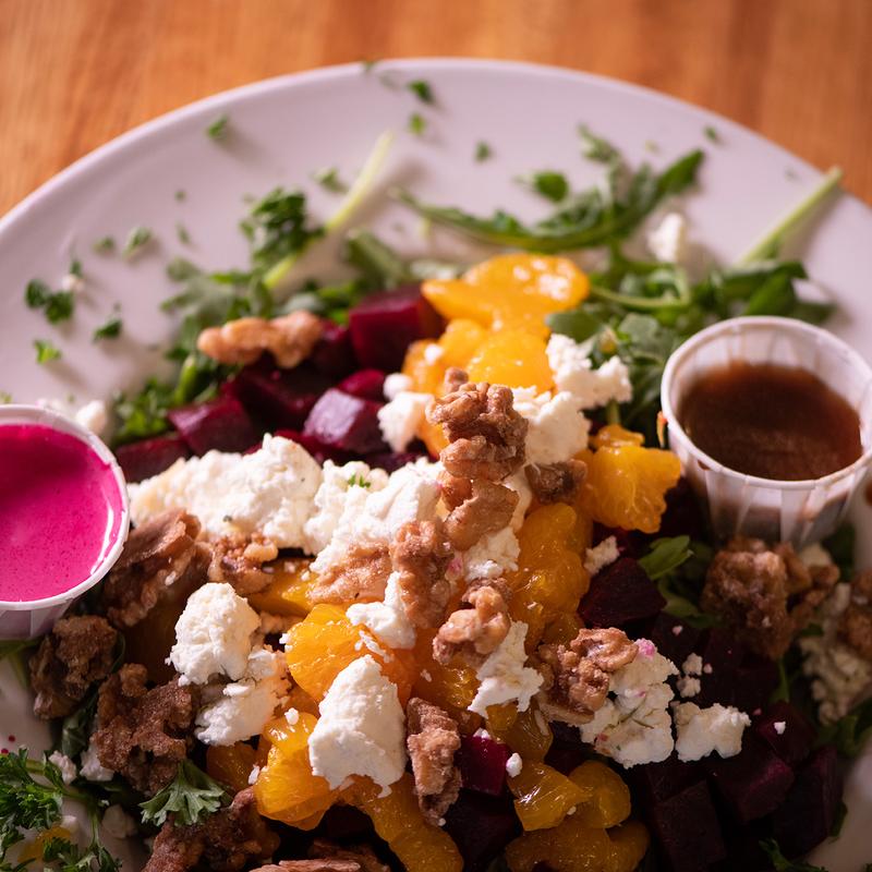 Arugula, fresh beets, orange segments, goat cheese and candied walnuts, served with house made beet dressing