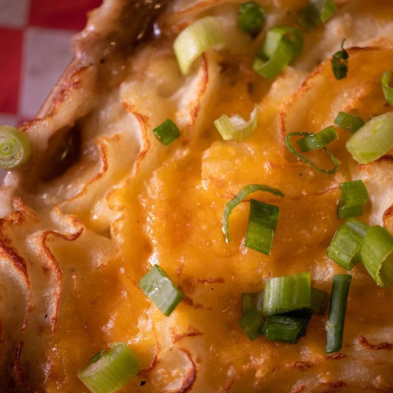 Traditional potato skins, topped with cheddar, bacon, sour cream, and green onions,